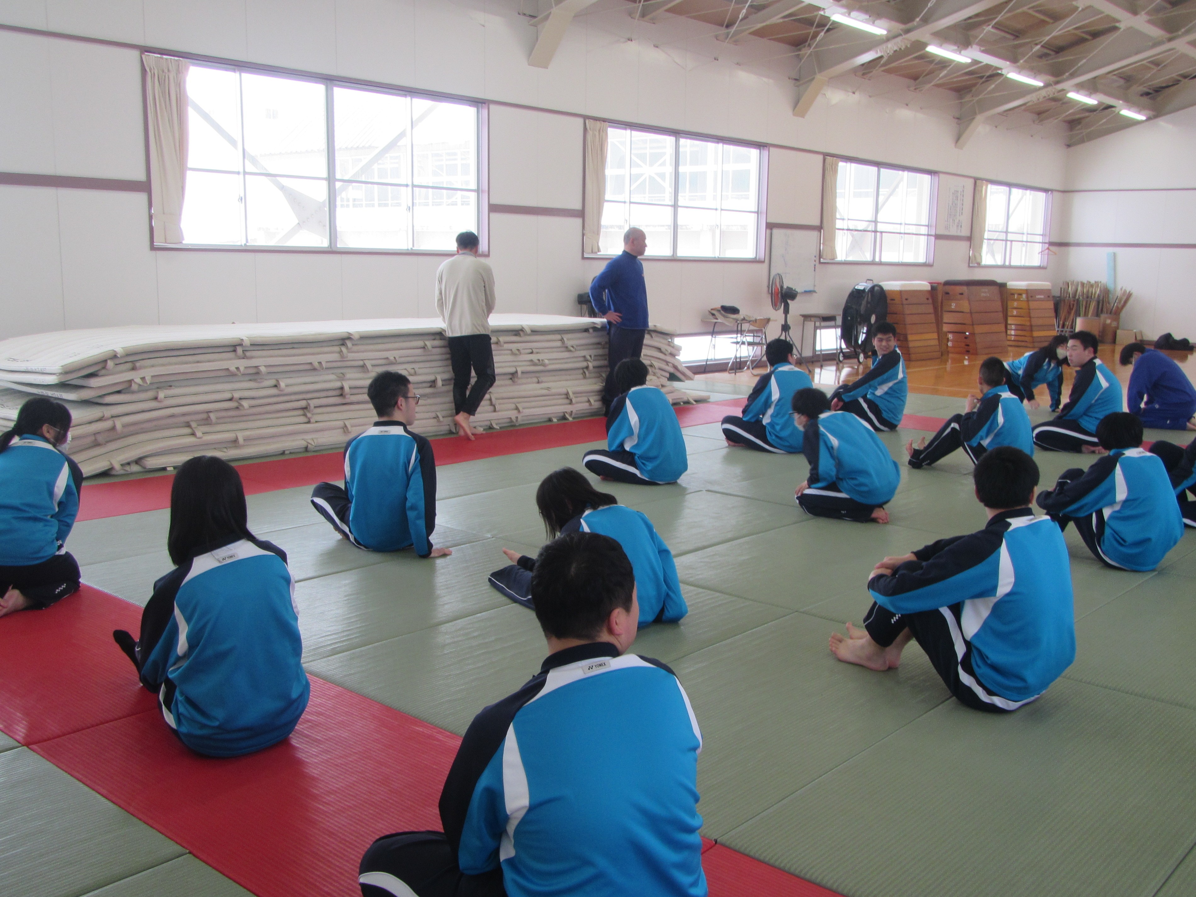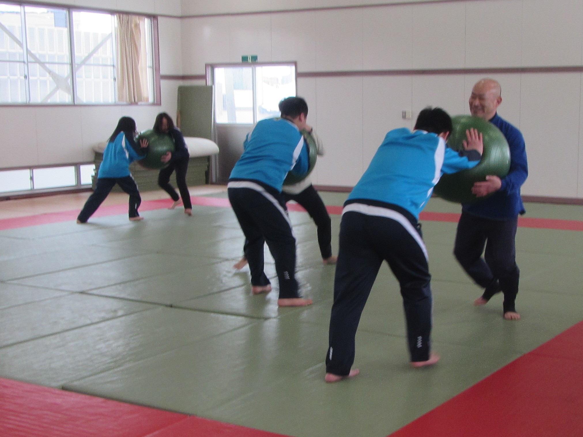 寒さに負けず相撲の稽古 スポーツの授業では武道(相撲)に取り組んでいます。見附市相撲協会会長の小泉勝様に教えていただきながら、手押し相撲をしたり、すり足で歩いたり、バランスボールを挟んでぶつかり稽古をしたりしています。